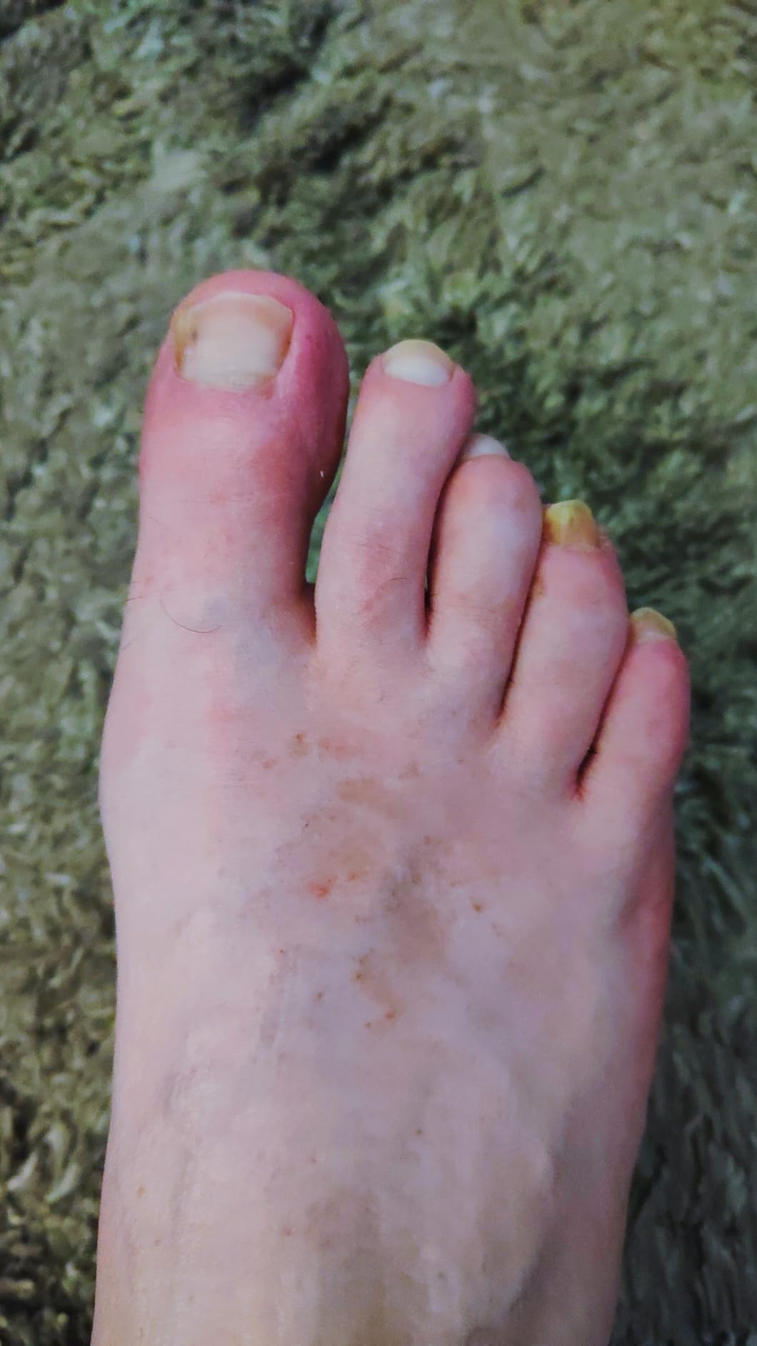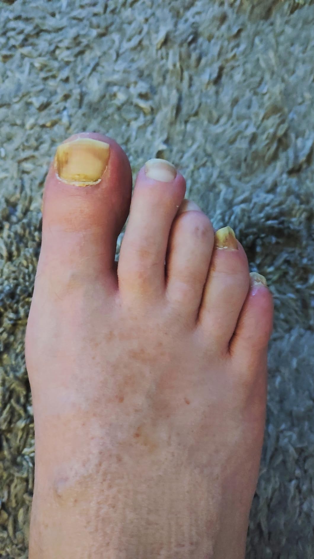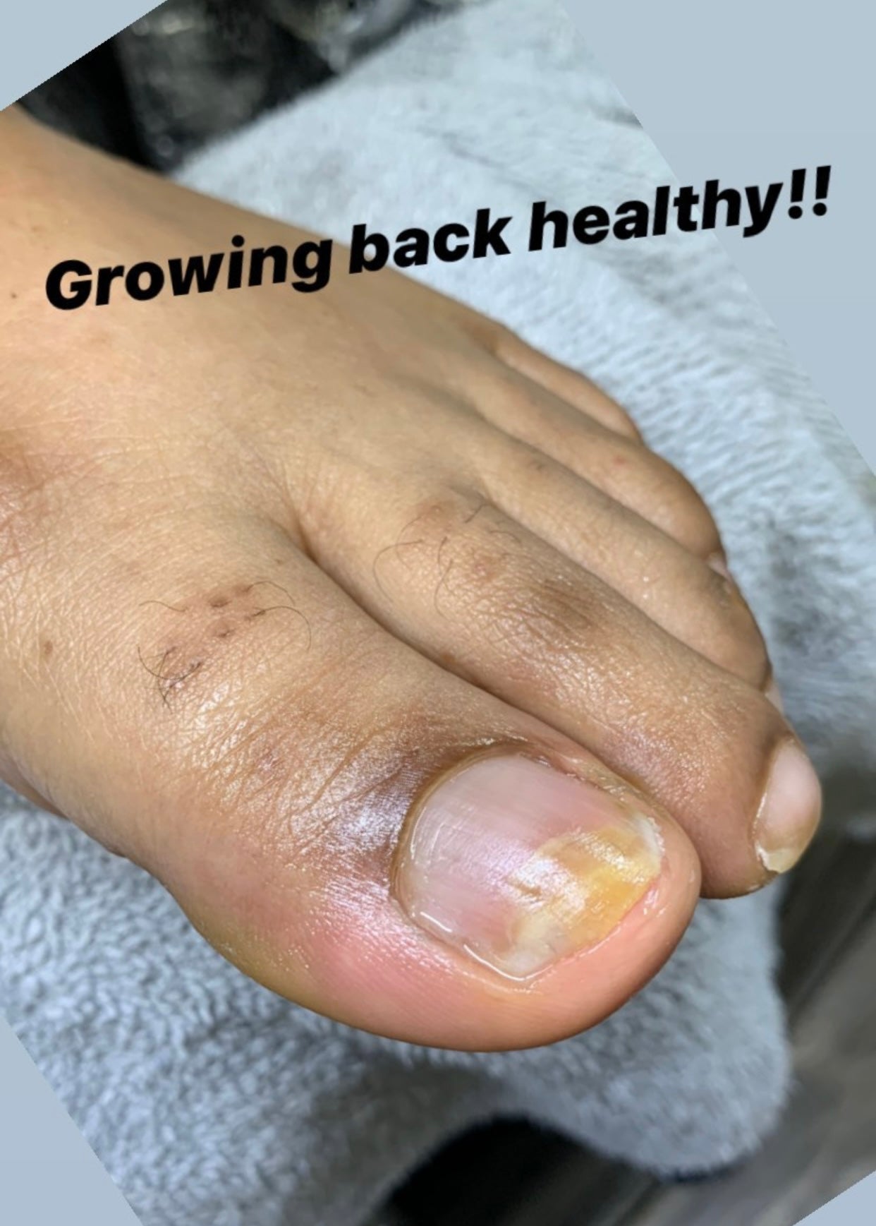 Diese Kundin bekam ihren ersten Termin im Oktober 2024. Das zweite Foto wurde im Januar 2025 aufgenommen. Sie führte die Behandlung zweimal täglich durch und feilte den infizierten Nagelpilz täglich.