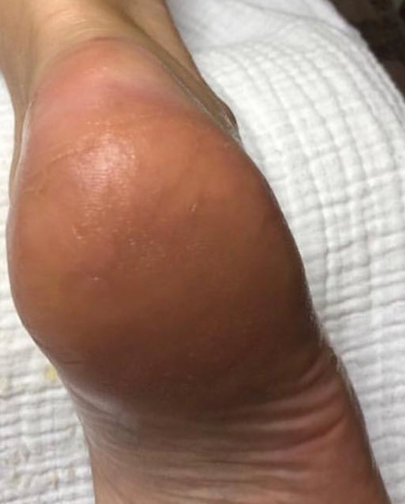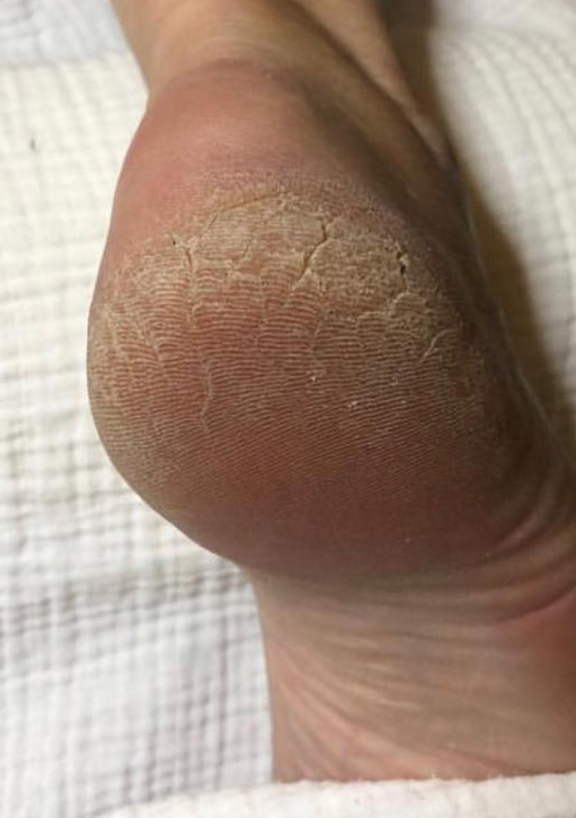 Diese Kundin besuchte ihren Podologen zum ersten Mal im Juni 2023. Das zweite Foto wurde im Januar 2024 aufgenommen. Sie wendete die Behandlung zweimal täglich an und kehrte alle sechs Wochen zu ihrem Podologen zurück.