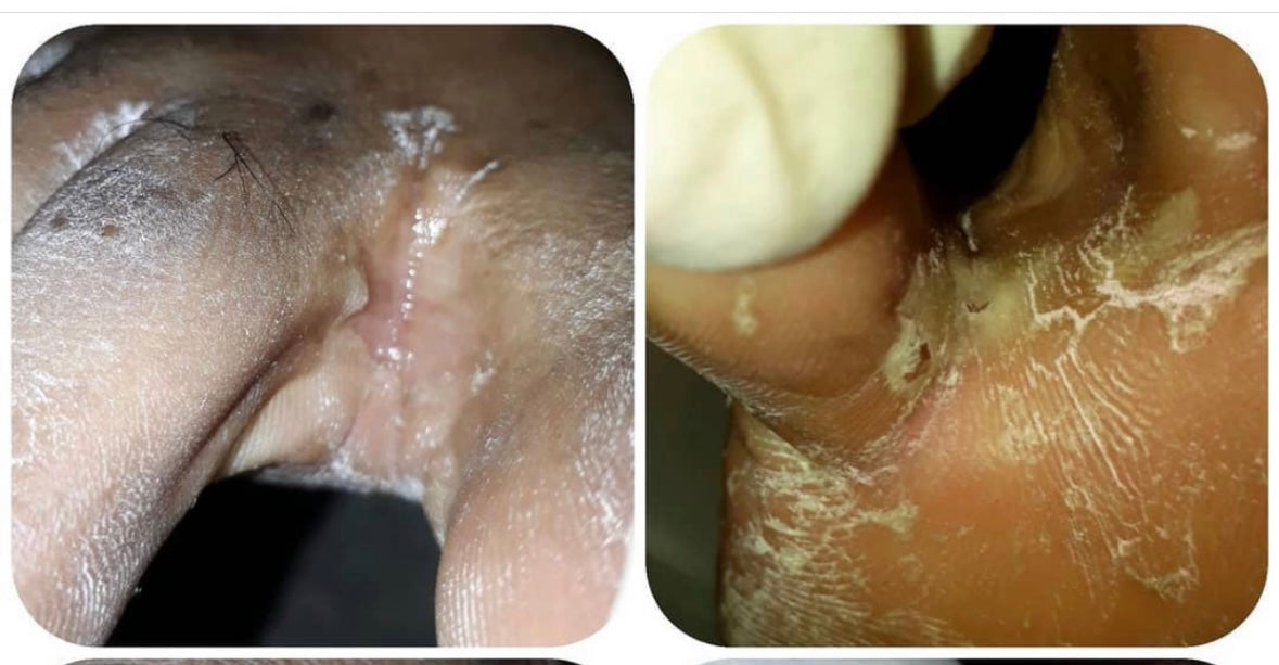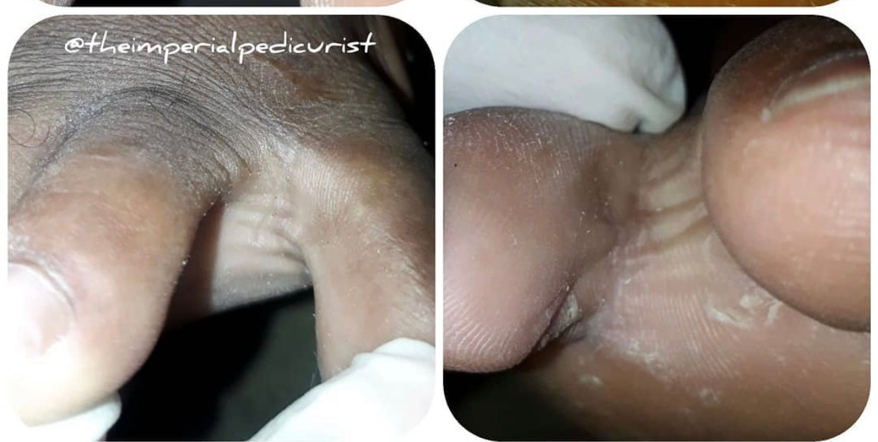 Bild 1 enthält zwei Vorher-Bilder. Das zweite Bild zeigt zwei Ergebnisse. Imperial Feet Fußpilz-Ergebnisse innerhalb von 2-3 Tagen. Fotos aufgenommen von @theimperialpedicurist (Instagram)