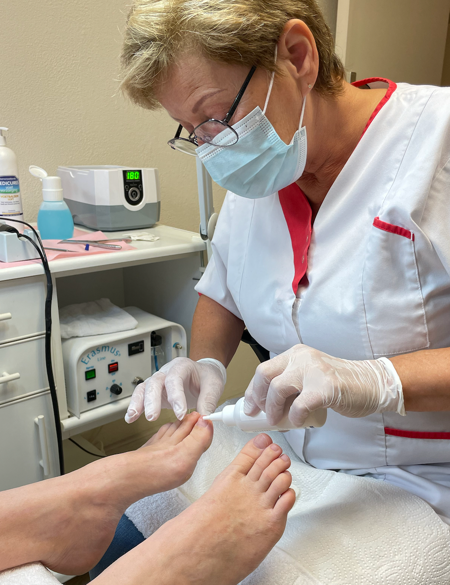 Use foot deo spray as a cleanser at the start of the treatment. Spray 5 times per foot and let it rest while working on the soles and toes.